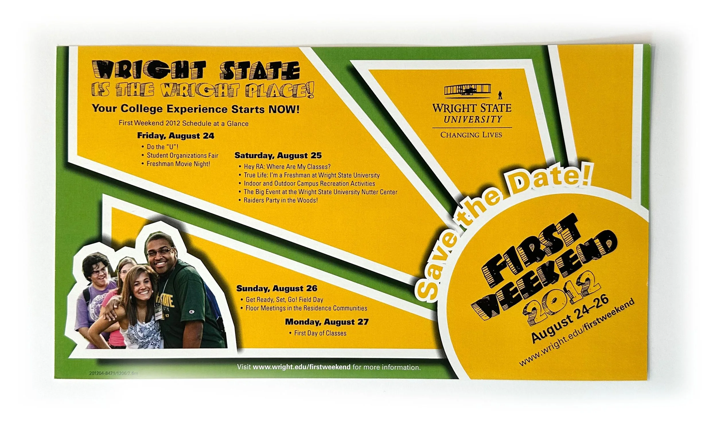 Front and back of a direct mail piece encouraging first-year students to attend freshman activites